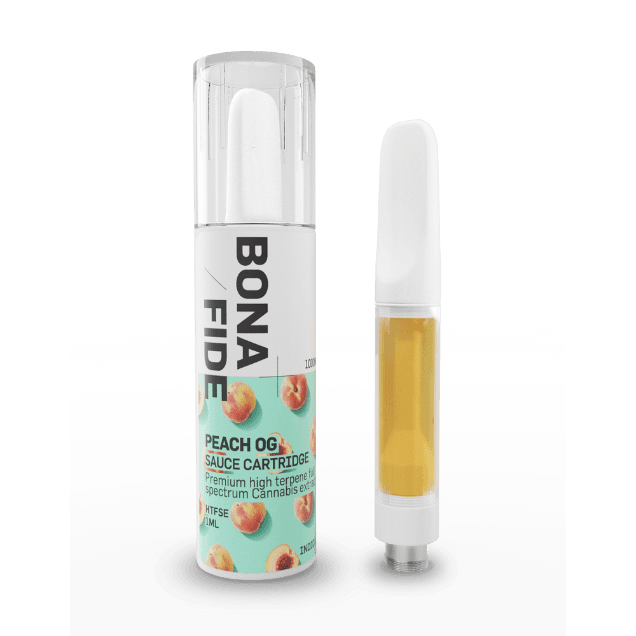 Bonafide Sauce Cartridge (Indica) – Peach OG blends clean extraction with true-to-strain flavour for smooth, dependable vapor from a 1-gram 510-thread cartridge. Expect steady performance and satisfying terpene character in every pull.